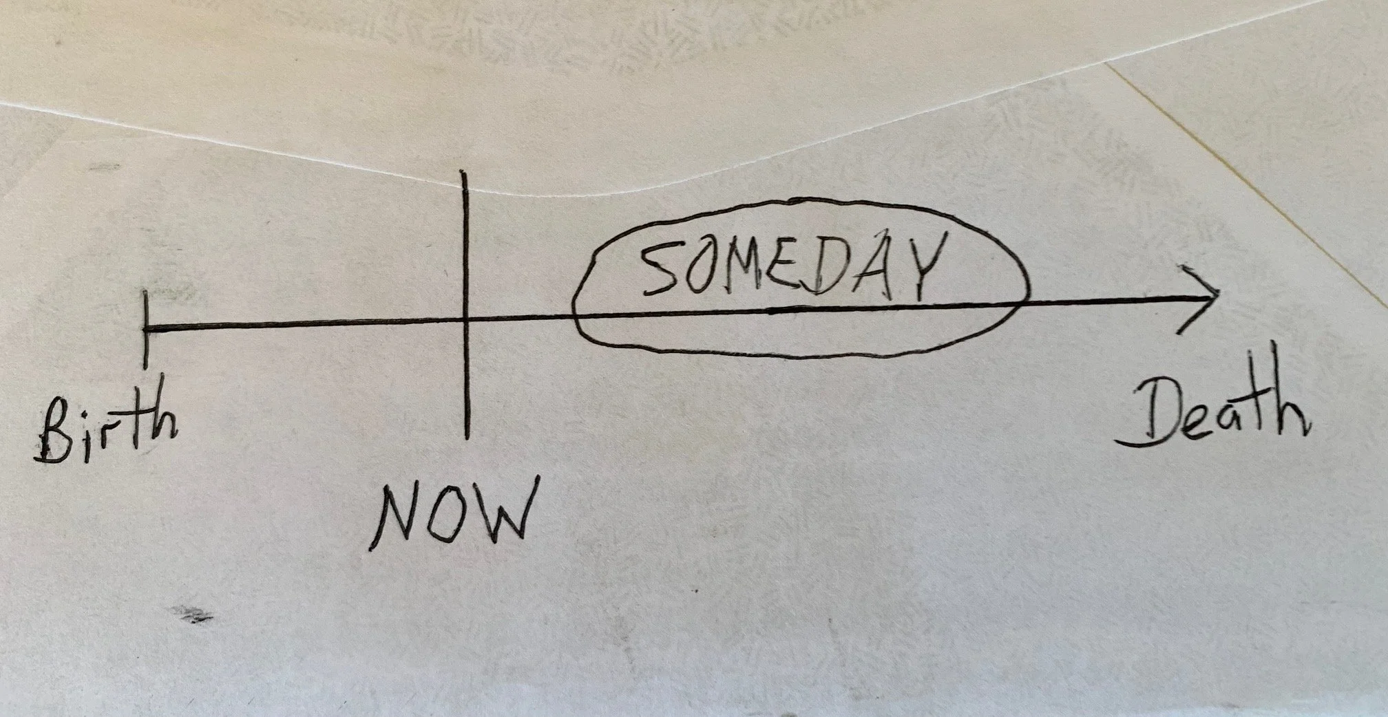 In the western world, we think of time as a line, with the past behind us and the future straight ahead. I can draw a horizontal line representing this trajectory, then, beginning on the left side of the paper, I can put a short vertical line to indicate a person’s birth. Way out at the end of the line, on the right hand side of the paper, I can draw another vertical line indicating the person’s death. Next, I can draw a vertical line where they are now in their life’s trajectory, perhaps one-third of the way along, if that person is the young woman from the dog food commercial. Last of all, I can draw a circle positioned between where the woman is now and the end of the line. Inside this circle, I could write “Someday.” But the worry is that Someday is always in front of her, but she never will catch up to it. The worry is that the line of where she is NOW will eventually overlap with that indicating her death but she never will have found the happiness she had been taught to project into the future.